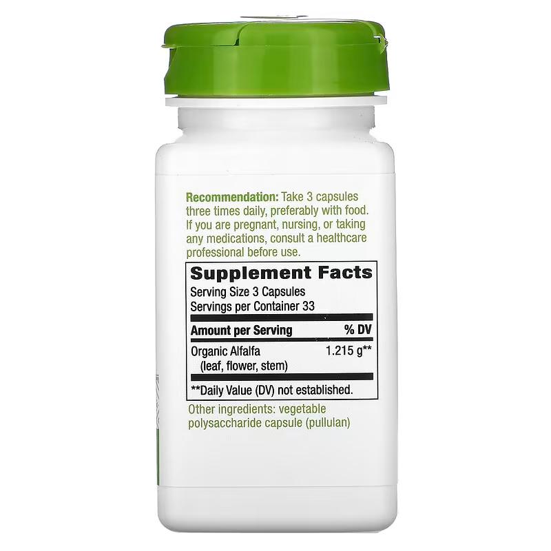 Люцерна, известная также как Medicago sativa, является одним из самых популярных травяных препаратов, предлагаемых брендом Nature's Way. Каждая капсула Люцерны от Nature's Way содержит 1,215 г высококачественного экстракта из травы люцерны. Этот препарат идеально подходит для веганов, так как он не содержит ингредиентов животного происхождения.