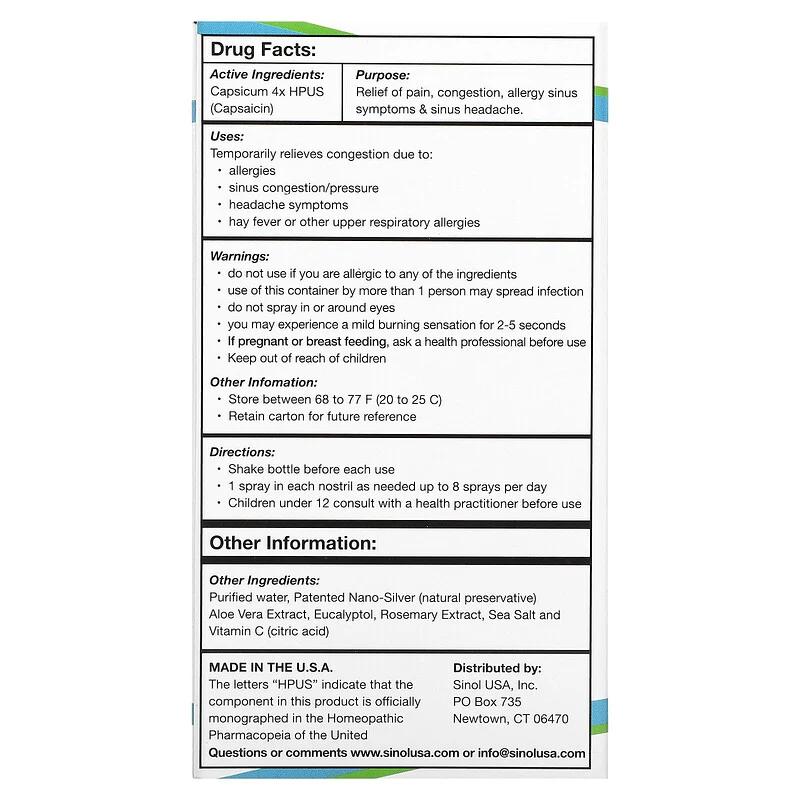 Перед использованием рекомендуется встряхнуть флакон. Пшикайте один или два распыления в каждую ноздрю, затем проведите резкий вдох через нос. Ощутите облегчение уже через несколько минут. Если заложенность не прошла, возможно использовать 2-3 распыления. Применяйте Синол по необходимости. Этот продукт не обладает сильными побочными эффектами и не вызывает привыкания. После использования плотно закройте крышку.