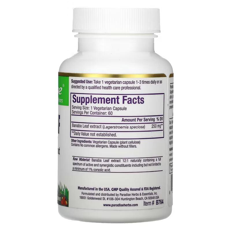 Лист банабы, Banaba Leaf, Paradise Herbs, 60 вегетарианских капсул