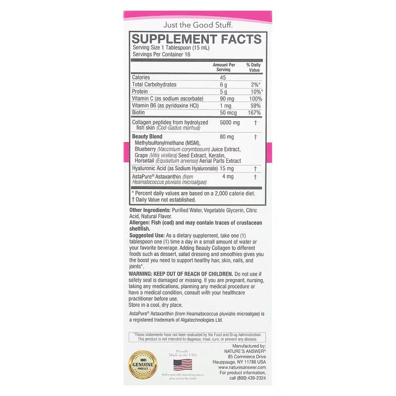 Коллагеновые пептиды от компании Nature's Answer, извлеченные из гидролизованной рыбьей кожи, поддерживают не только здоровье кожи, но и волос, ногтей, костей и суставов. Метилсульфонилметан играет ключевую роль в синтезе коллагена и глюкозамина, обеспечивая поддержание здоровья суставов и укрепление кератина в ваших волосах. Сочетание сока черники и экстракта виноградных косточек приносит вам проантоцианы с антиоксидантными свойствами, способствуя здоровью вашей кожи и волос. Гиалуроновая кислота улучшает эластичность кожи, делая ее молодежной и упругой.