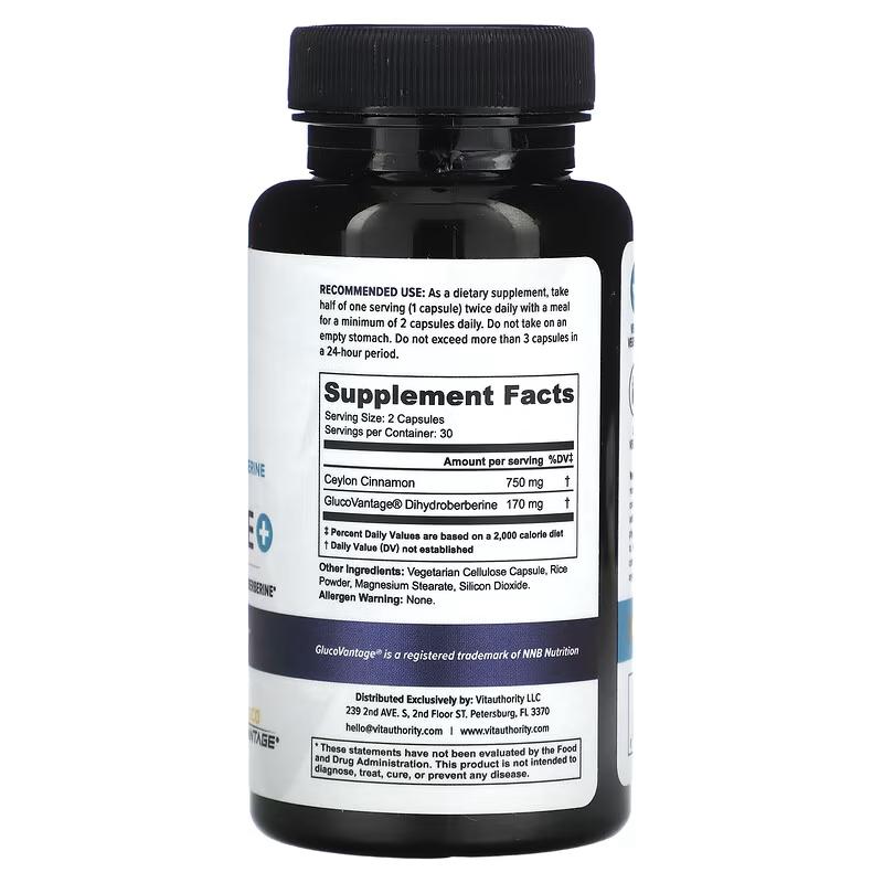 В добавке Berberine+ от компании Vitauthority используется инновационный ингредиент дигидроберберин GlucoVantage®, обеспечивающий до 5 раз больше биоактивных свойств по сравнению с обычным берберином. Берберин является одним из наиболее перспективных соединений для повышения чувствительности к инсулину, а исследования показывают, что дигидроберберин представляет собой улучшенную форму этого вещества. Сочетание ингредиентов, которые работают совместно для поддержки здоровья сердечно-сосудистой системы, регулирования уровня сахара в крови и общего благополучия организма. Вегетарианские капсулы обеспечивают удобство при применении и соответствуют диетам веганов и вегетарианцев.
