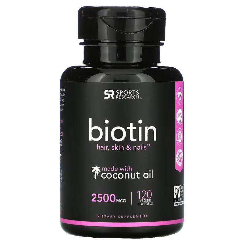 Биотин с кокосовым маслом, Biotin with Coconut Oil, Sports Research, 2500 мкг, 120 вегетарианских капсул