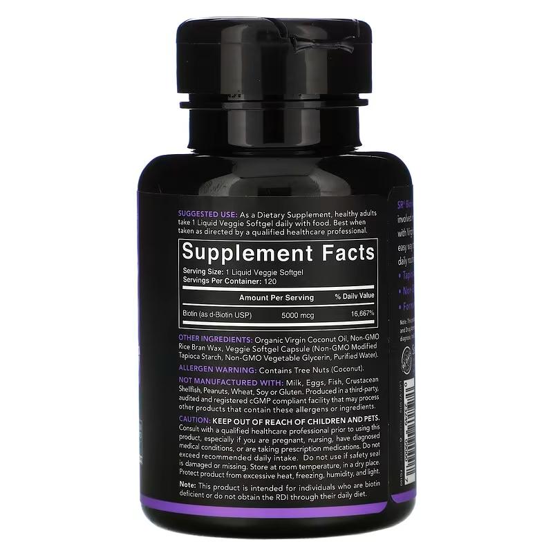 Биотин с кокосовым маслом, Biotin with Coconut Oil, Sports Research, 5000 мкг, 120 растительных капсул