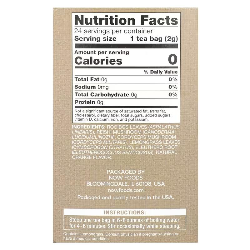 Чай с грибами ройбуш и рейши, без кофеина, Rooibos Reishi Mushroom Tea, Caffeine Free, NOW Foods, 24 чайных пакетика, 48 г