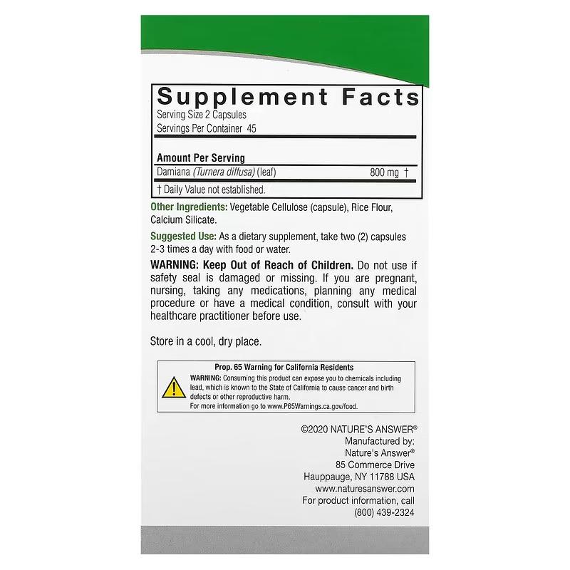 Дамиана, Damiana, Nature's Answer, 90 вегетарианских капсул