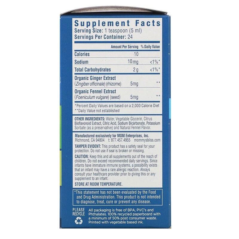 Детская водичка от колик Gripe Water от Mommy's Bliss - один из самых необходимых препаратов в аптечке для новорожденных. Натуральное, безопасное средство используется в первые месяцы жизни малыша (от 2 недель и старше) и рекомендовано ведущими педиатрами. В составе водички нет парабенов, аллергенов, сахара и алкоголя, присутствуют только растительные компоненты: экстракты фенхеля и имбиря. В медицине - это базовые продукты при лечении колик.