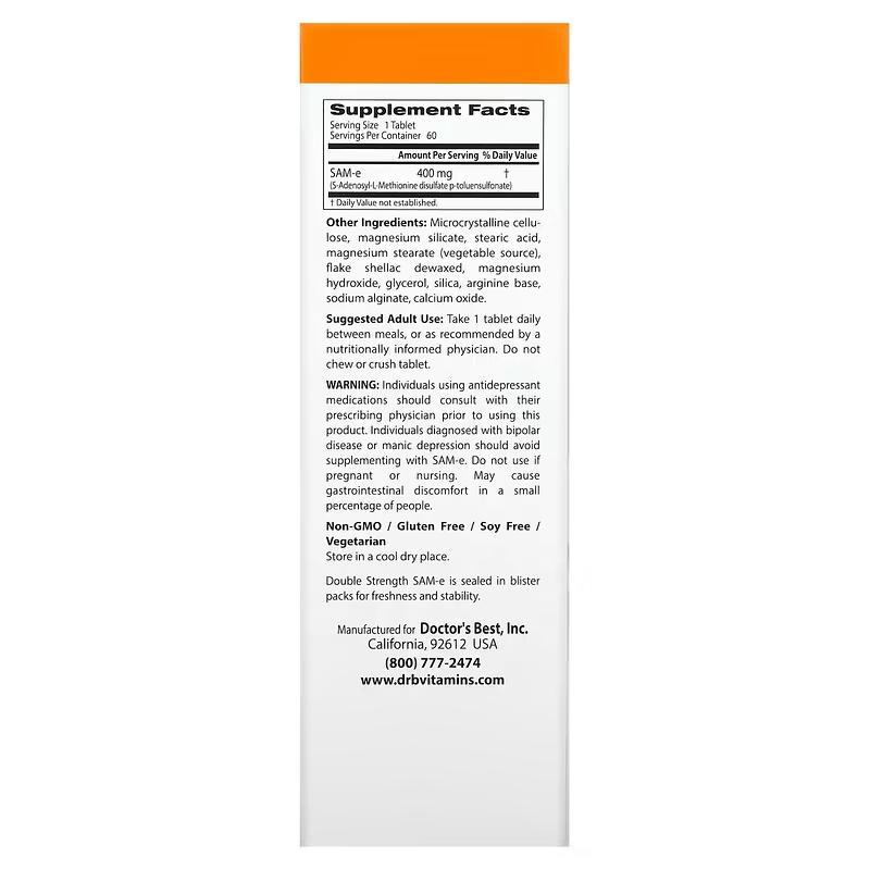 Дисульфат тозилат двойной силы, Double Strength SAM-e Disulfate Tosylate, Doctor's Best, 400 мг, 60 таблеток, покрытых кишечнорастворимой оболочкой
