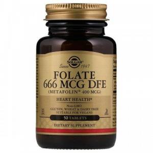 Фолиевая кислота, Folate DFE, Solgar, метафолин, 400 мгк (666 мкг), 50 таблеток
