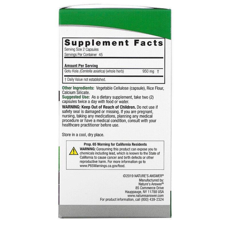 Готу кола, Gotu Kola, Nature's Answer, 475 мг, 90 вегетарианских капсул