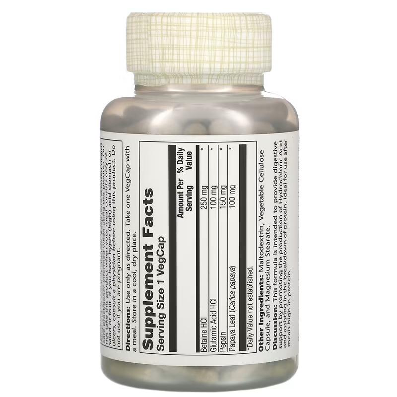 Белые кристаллы или кристаллический порошок, содержащие соляную кислоту и действующие как вторичное питание, характеризуют HCL with Pepsin от компании Solaray. Белки, витамин В12, железо и кальций не могут усваиваться должным образом без этого фактора. Сахарная свекла используется для производства химического бетаина гидрохлорида, так что не бойтесь купить эту добавку, ведь она натуральная.