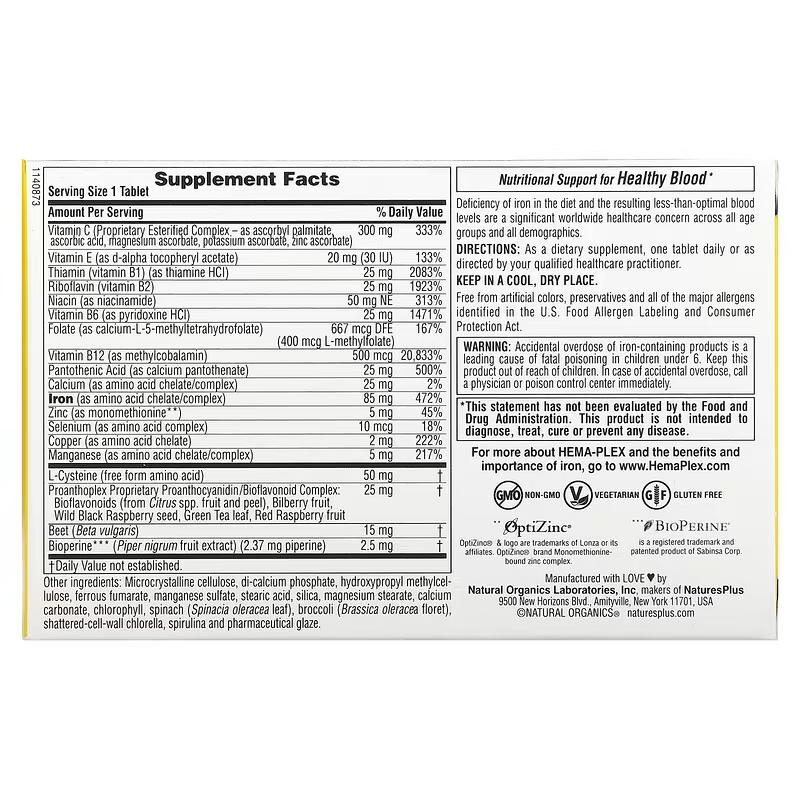 Препарат Hema-Plex от компании NaturesPlus — это пищевая добавка, разработанная для поддержания здоровья крови и уровня железа в организме. Этот продукт обогащен железом и другими питательными веществами, которые способствуют поддержанию нормального уровня железа в организме, а также улучшению здоровья крови. В составе Hema-Plex от компании NaturesPlus присутствуют важные микроэлементы, витамины и минералы, такие как железо, витамин C, фолиевая кислота и другие. Эти компоненты важны для образования красных кровяных клеток и поддержания нормального гемоглобина.