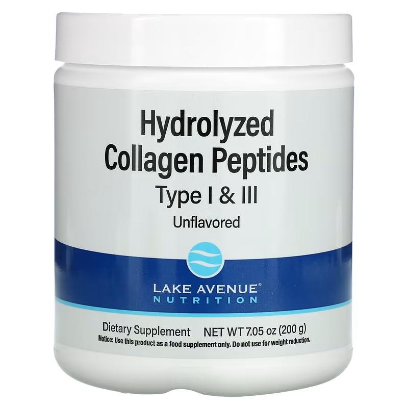 Гидролизованные пептиды коллагена типов I и III, с нейтральным вкусом, Hydrolyzed Collagen Peptides Type I & III Unflavored, Lake Avenue Nutrition, 200 г