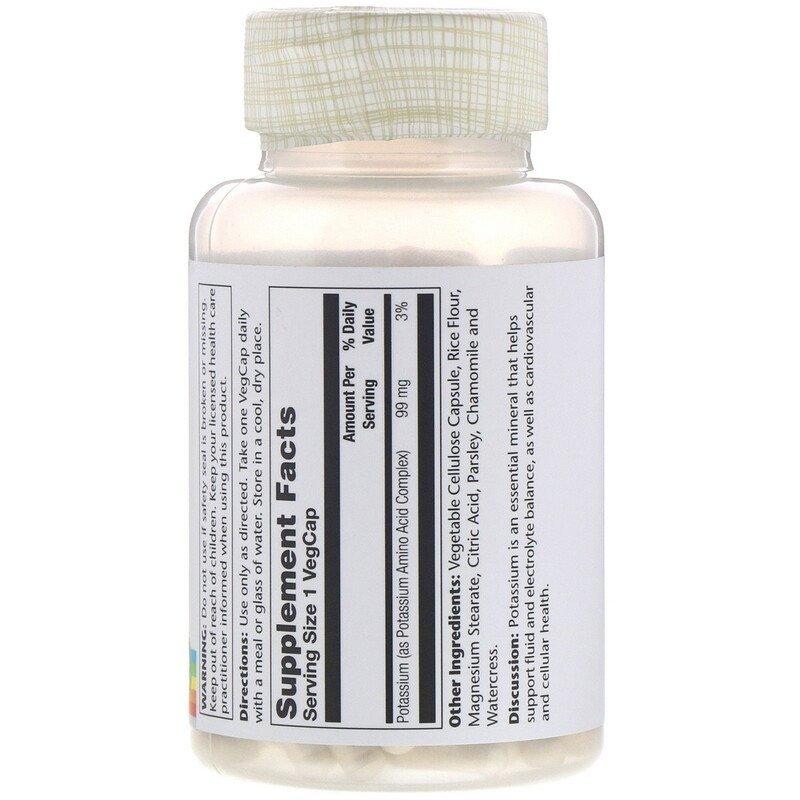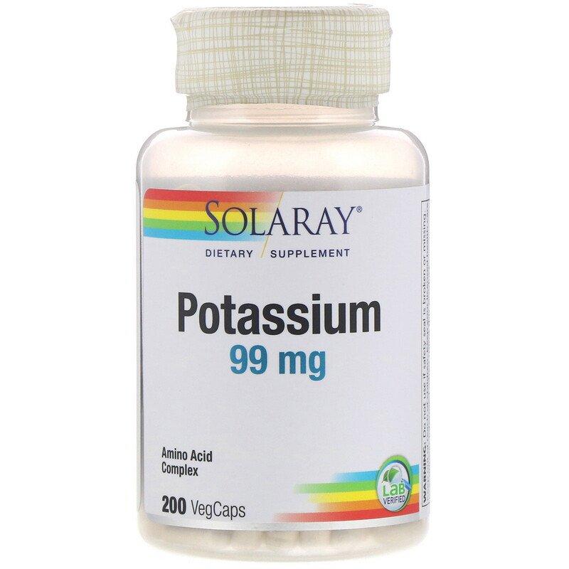 Калий, Potassium, Solaray, 99 мг, 200 вегетарианских капсул