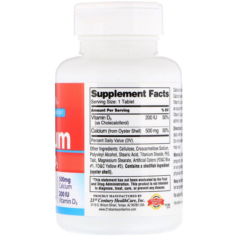 Компания 21-st Century предлагает биодобавку Calcium 500+D3. Упаковка содержит 90 таблеток, содержащих 500 мг кальция в сочетании с витамином Д3. Это идеальный комплекс для наилучшего усвоения обоих компонентов. Поскольку кальций обладает высокой активностью и практически не существует в несвязанном виде, то целесообразно применение его именно в сочетании с препаратом Д3, который способствует лучшему всасыванию кальция в тонком кишечнике.