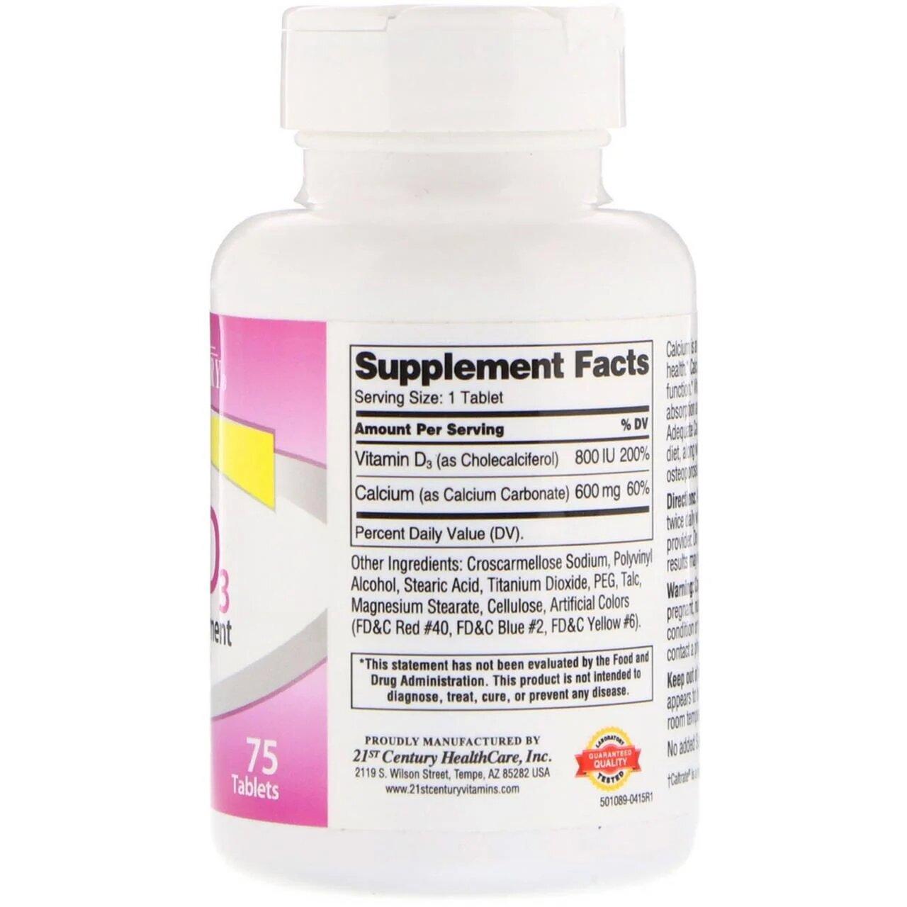 Кальций 600 + D, Calcium Supplement, 21st Century, 75 капсул