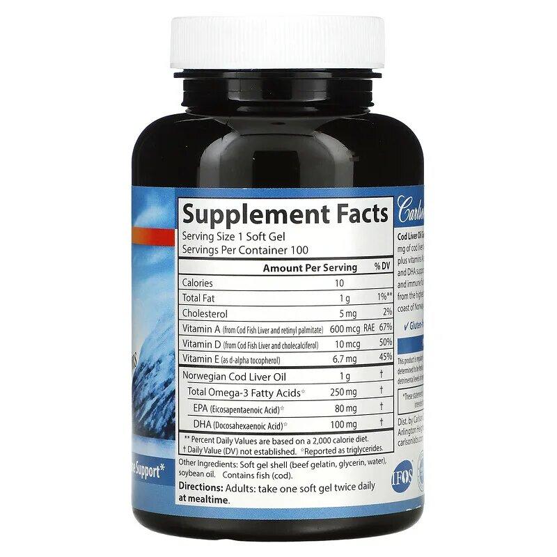 В капсулах из жира печени дикой норвежской трески высшего качества содержится 1000 мг жира печени трески, 250 мг кислот омега-3, а также витамины A и D3. ЭПК и ДГК в омега-3 поддерживают сердечно-сосудистую, когнитивную и иммунную функции. Данный препарат изготавливается из высококачественной норвежской трески природного происхождения, которая вылавливается с применением традиционных безопасных методов.