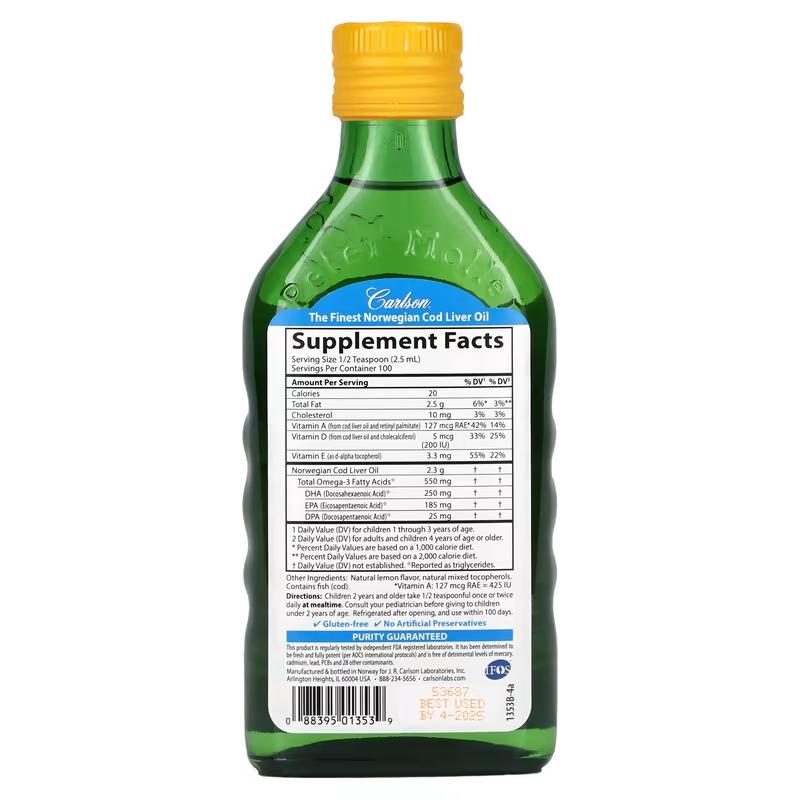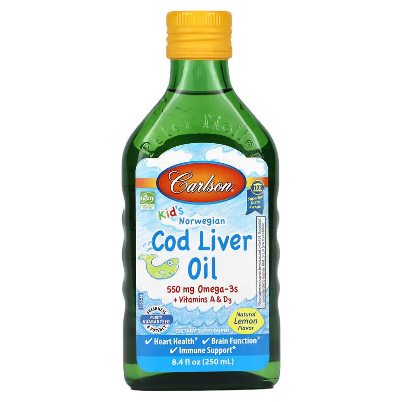 Тем не менее «традиционный» рыбий жир, вероятно, не то, что ваш ребенок будет принимать с аппетитом и радостью. Таким образом, вместо привычной выпускаемой формы в виде капсул или сиропа можно купить другие натуральные вкусы. Например, Kid's Norwegian Cod Liver Oil Natural Lemon от бренда Carlson Labs.