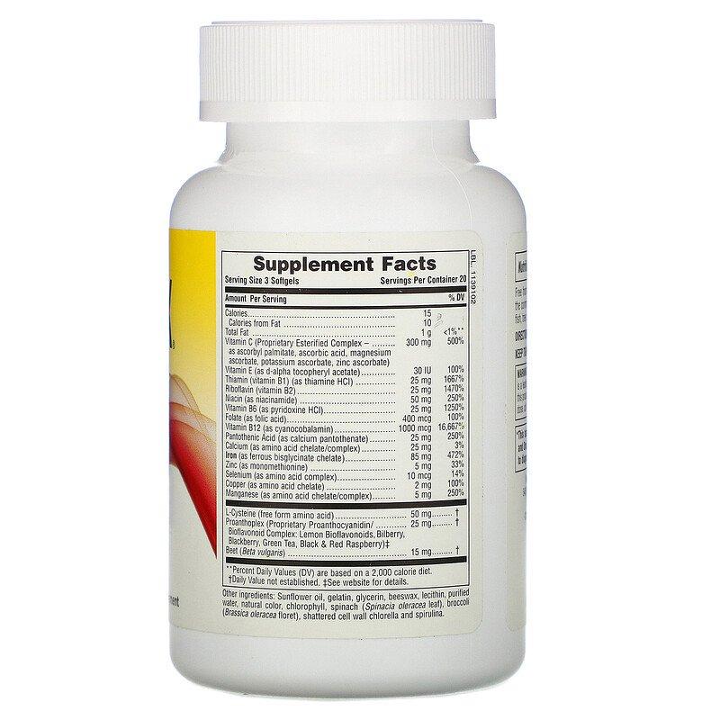 | Витамин С (запатентованные этерифицированные композиции (в виде аскорбилпальмитата, аскорбиновой кислоты, аскорбата магнезии, аскорбата калия, аскорбата цинка) | 300 мг | 500% |