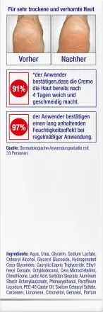 Вода, мочевина, глицерин, лактат натрия, цетеариловый спирт, глицерилглюкозид, гидрогенизированные коко-глицериды, каприловый/каприновый триглицерид, этилгексилкокоат, октилдодеканол, микрокристаллический воск, диметикон, молочная кислота, сорбитанстеарат, октенилсукцинат алюминиевого крахмала, феноксиэтанол, вазелиновое масло, касторовое масло ПЭГ-40, цетеарилсульфат натрия, карбомер, лимонен, цитронеллол, гераниол, отдушка.