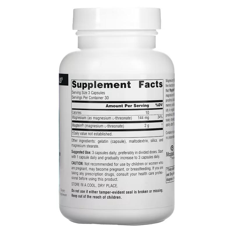 Magtein от Source Naturals — это пищевая добавка, которая включает треонат магния и помогает улучшить когнитивные функции и здоровье мозга. Развитие костной и нервной ткани зависит от магния (Mg), что делает его важнейшим элементом.