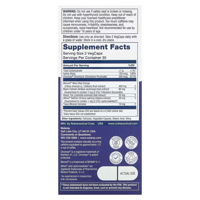 Менопауза - это естественный этап в жизни каждой женщины, и важно заботиться о своем здоровье в этот период. Препарат Менопауза от Solaray специально разработан, чтобы помочь вам пережить этот этап более комфортно. Этот продукт содержит богатый комплекс растительных ингредиентов, которые могут помочь смягчить некоторые из типичных симптомов менопаузы.