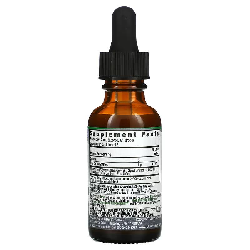 Ваша печень является важной частью вашей пищеварительной системы. Важно сохранить ее здоровой. Milk Thistle от Nature's Answer — это естественный способ стимулировать здоровую функцию печени. Расторопша с суперконцентрацией 2000 мг на порцию также способствует детоксикации печени и выведению шлаков. Препарат представляет собой жидкий экстракт, он усваивается быстрее, чем таблетки или капсулы.