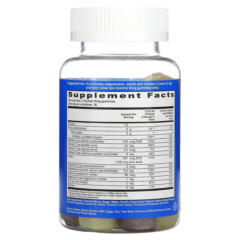 GummiKing — это детские мультивитамины и минералы в форме жевательных мармеладок с разными вкусами, такими как клубника, апельсин, лимон, виноград, черешня и грейпфрут. Каждая упаковка содержит 60 жевательных мармеладок. GummiKing имеет разные вкусы, что делает их более привлекательными для детей и облегчает прием витаминов и минералов.