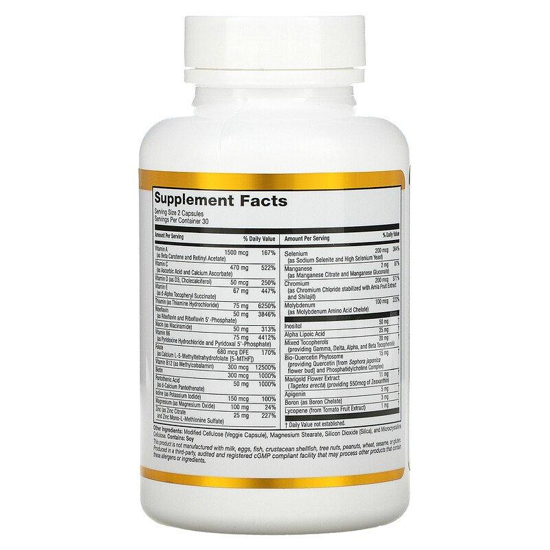 Комплексная добавка California GOLD Nutrition, не содержащая вредных ГМО и глютенов предназначена для каждодневное приема вместе с пищей при нехватке витаминов. Она состоит из 25 важных для организма микроэлементов, минеральных и витаминный соединений. Эти мультивитаминные биодобавки производит предприятие, которое имеет надлежащую регистрацию, и проверяются на эффективность независимыми экспертами. В результате проверок доказана стопроцентная гарантия Gold Guarantee.