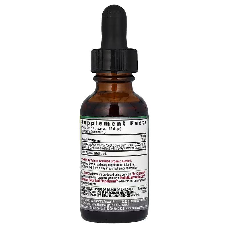 Компания Nature's Answer представляет эксклюзивный продукт — суперконцентрированный жидкий экстракт Myrrh, полученный из высушенной на солнце древесной смолы деревьев Мирра или Коммифора абиссинского. Этот уникальный продукт разработан для поддержки иммунной системы с использованием органического спирта и технологии био-хелатного процесса холодной экстракции. Myrrh, известная своим широким спектром полезных свойств, является ценным лекарственным растением, и этот экстракт обеспечивает максимально возможное качество и эффективность.