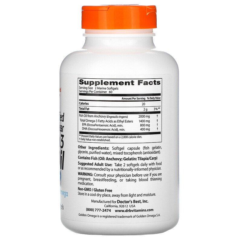 В процессе производства рыбьего жира задействована запатентованная фильтрации, который обеспечивает очень низкий коэффициент общего окисления TOTOX, который показывает на сколько рыба свежая. Чем ниже показатель TOTOX , тем выше качество рыбы. В качестве сырья используется только чистый жир анчоусов обитающих в южно-тихоокеанском ареале и имеющих сертификат качества. Светлый цвет пищевой добавки - главный показатель ее чистоты. Биодобавка Doctor's Best содержит рыбий жир из экологически чистых регионов. В одной порции добавки - ЭПК в концентрации 800 мг и ДГК в концентрации 400 мг . Рыбий жир с омега-3 поддерживает здоровье организма и позитивно влияет на его системы: