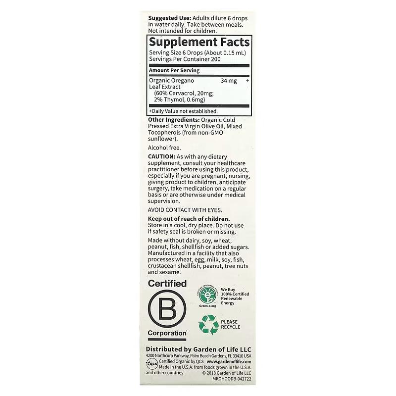 Масло орегано, сезонные капли, Oil of Oregano Seasonal Drops, Garden of Life MyKind Organics, 30 мл