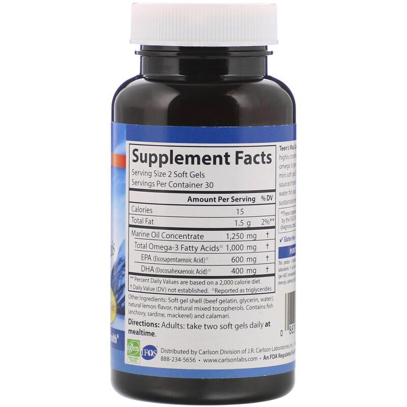Поддержать здоровье подрастающего поколения с помощью омега-3 просто, достаточно купить инкапсулированную биодобавку Carlson Labs онлайн. Биоактивный комплекс содержит высококачественный концентрат рыбьего жира, полученного из кальмаров и глубоководной рыбы. Производится с использованием экологически чистых процессов. Teen's Max Catch Minis обладает идеальной для молодого организма концентрацией ключевых DHA и EPA, 400 мг и 600 мг соответственно.