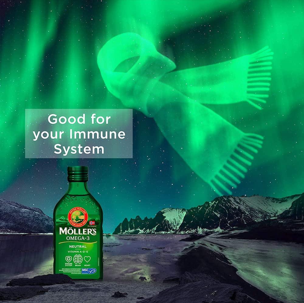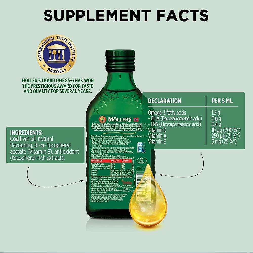 Масло печени трески входящий в состав в Tran Norwegian от компании Moller’s, содержит витамин D3 в дополнение к омега-3 жирным кислотам DHA и EPA, содержащимся в масле. Мозг и зрение получают пользу от адекватного потребления кислот омега-3 ДГК. ДГК и ЭПК, две жирные кислоты омега-3, помогают поддерживать здоровье сердца и его работу. Нормальному развитию костей и зубов способствует витамин D. Иммунитет укрепляется витамином D и а. Витамин А помогает поддерживать здоровье глаз.