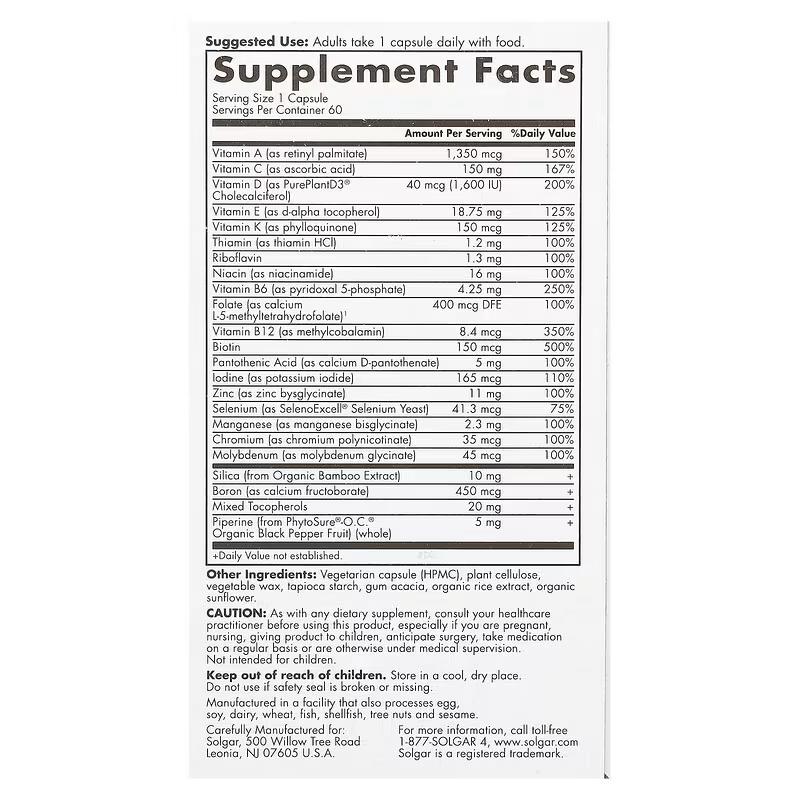 Среди ключевых компонентов: Витамин D для укрепления костей, витамин B12 для поддержания энергетического обмена и фолиевая кислота для улучшения когнитивных функций. Препарат произведен с использованием высококачественных ингредиентов, не содержит глютен, пшеницу и молочные продукты, что делает его подходящим для женщин с чувствительностью к этим компонентам. Удобная упаковка в 60 капсул обеспечивает полный курс приема на два месяца. Поддержите свое здоровье и благополучие с One Daily Women's Multi 50+ от бренда Solgar, доступным для покупки в интернет-магазине ForHealth.
