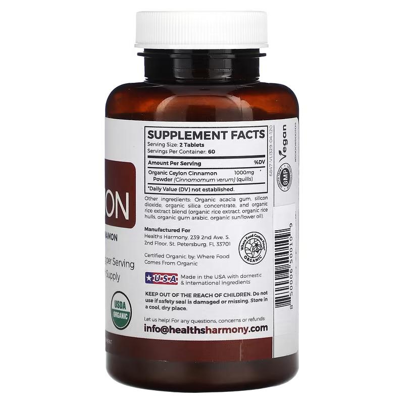 Органическая цейлонская корица, Organic Ceylon Cinnamon, Healths Harmony, 500 мг, 120 таблеток