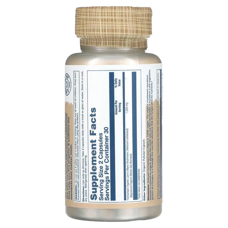 Ферментированный гриб ежовик гребенчатый, выращенный органическим способом, Organic Fermented Lion's Mane, Solaray, 500 мг, 60 растительных капсул