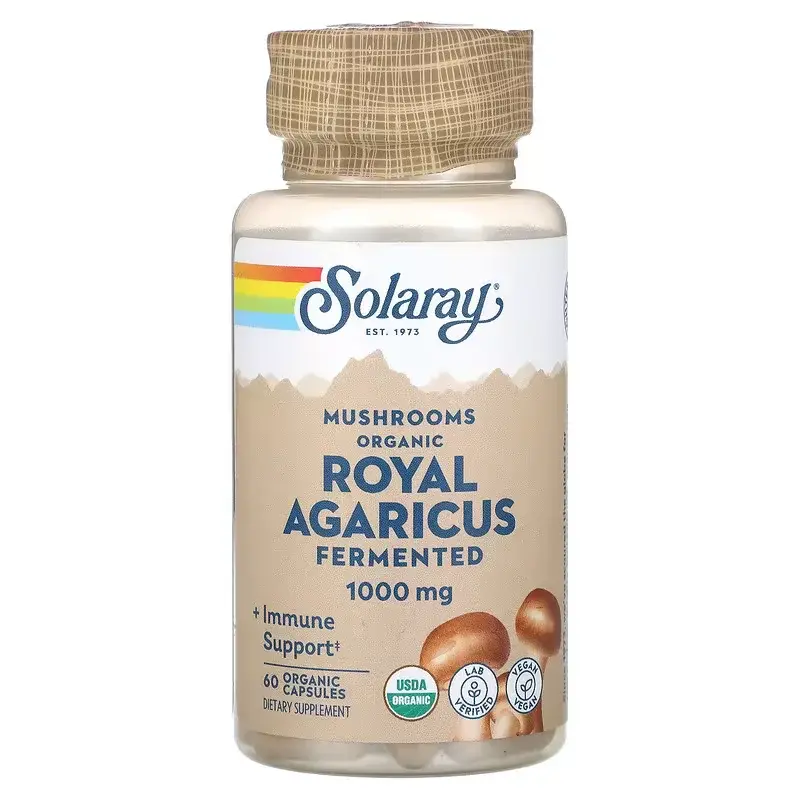 Королевский агарик (Royal Agaricus) от компании Solaray — это 100% веганская пищевая добавка, изготовленная из ферментированной органически выращенной мицелиальной биомассы гриба королевского агарикуса. Мицелий, растительная часть гриба, отвечает за поглощение питательных веществ. Органическую мицелиальную биомассу культивируют на безглютеновом цельном овсе, а затем подвергают ферментации. Агарик от компании Solaray является полезным грибом, поддерживающим иммунную систему, регулирующим здоровый уровень глюкозы в крови, восстанавливающим функцию печени, нормализующим вес, очищающим организм от токсинов и шлаков. Этот гриб также используется при неврологических и раковых заболеваниях, диабете и болезнях легких. Он оказывает успокаивающее, кровоостанавливающее и слабительное действие.