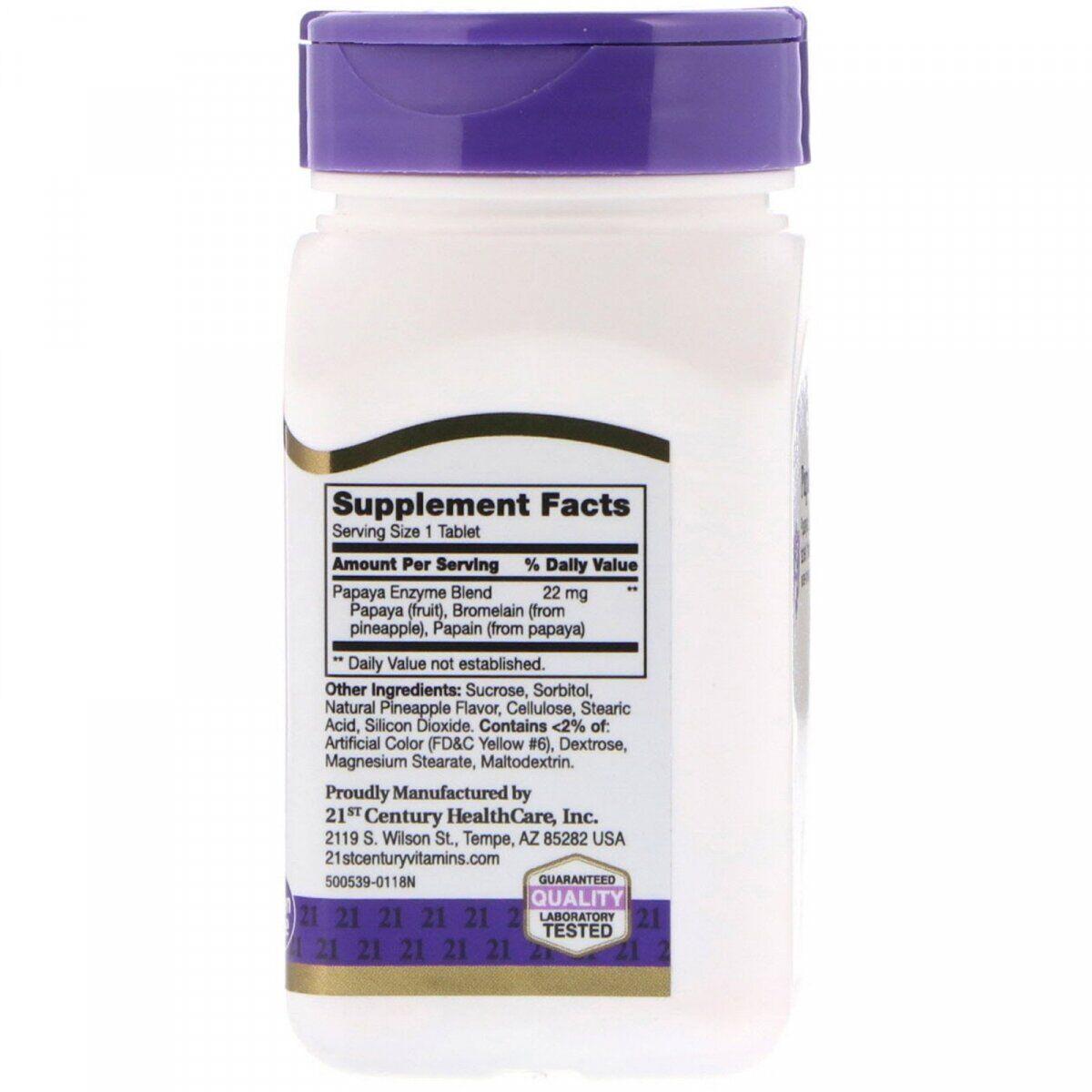 Один из лучших и эффективных препаратов из группы ферментов, разработанный 21st Century, известной американской компанией, которая занимается производством витаминов и биологически активных добавок. Papaya Enzyme разработан на основе уникальных ферментов ананаса, которые отлично расщепляют белки и способствуют лёгкому и быстрому усвоению пищи. В результате постоянного приёма препарата, быстро и надолго исчезают неприятные ощущения, как во время так и после принятия пищи. Такие как вздутие, тяжесть, боль в желудке и тошнота.