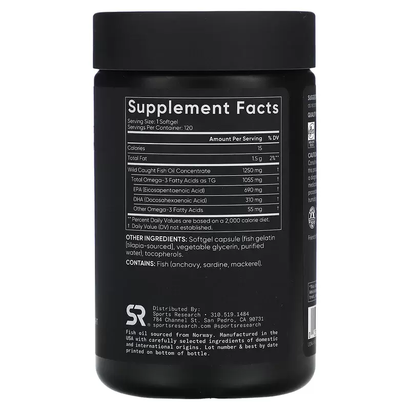 Рыбий жир с Omega-3 от компании Sports Research содержит в три раза больше активных действующий веществ в каждой капсуле. В качестве исходного продукта используется дикая рыба северных видов, выловленная в экологически чистых регионах.