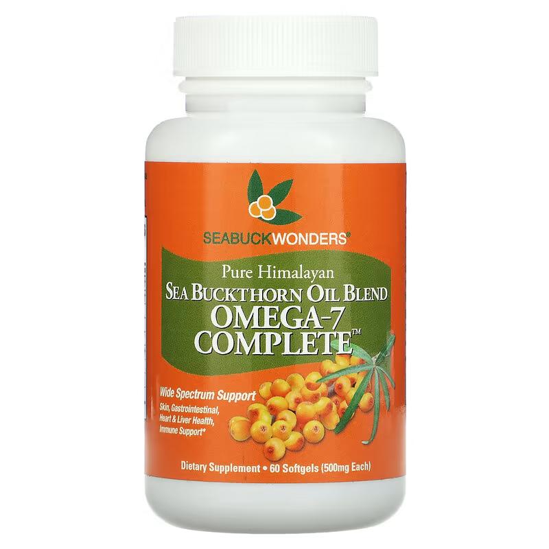 Omega-7 Complete от компании SeaBuckWonders изготовлен из лучшего, сертифицированного органического, 100% чистого, сверхкритического экстракта масла гималайской облепихи: ягодного масла, содержащего более 32% пальмитолеиновой кислоты (Омега-7), и масла семян с высоким содержанием Омега-3, 6, 9, витамин А, Е и СОД (супероксиддисмутаза). Облепиховое масло, содержащее более 190 биологически активных питательных веществ и богатое антиоксидантами, отлично подходит для питания клеточных мембран и широко используется для здоровья кожи, желудочно-кишечного тракта, сердца, печени, холестерина, мочевыделительной системы, шейки матки и иммунной поддержки.