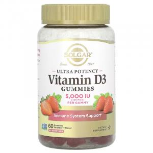 Жевательный витамин D3 повышенной эффективности, со вкусом клубники, Ultra Potency Vitamin D3 Gummies Strawberry, Solgar, 125 мкг (5000 МЕ), 60 жевательных таблеток