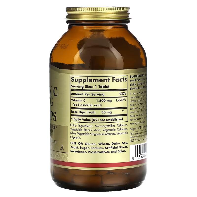 Витамин С с шиповником, Vitamin C with Rose Hips, Solgar, 1500 мг, 180 таблеток