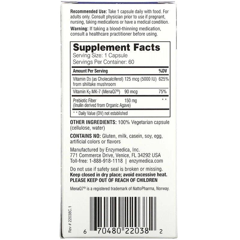 Витамин D3 извлекается из грибов шиитаке - традиционного ингредиента китайской медицины, используемого для поддержки иммунитета и стимулирования жизненной силы. K2 находится в своей ценнейшей, клинически доказанной форме MenaQ7, получаемой из нута. Биодобавка Enzymedica также усилена инулином, извлеченным из голубой агавы органического выращивания. Эта природная клетчатка действует подобно пребиотику, поддерживая пищеварительную систему и питая микробиом, от которого зависит около 70% иммунной системы.