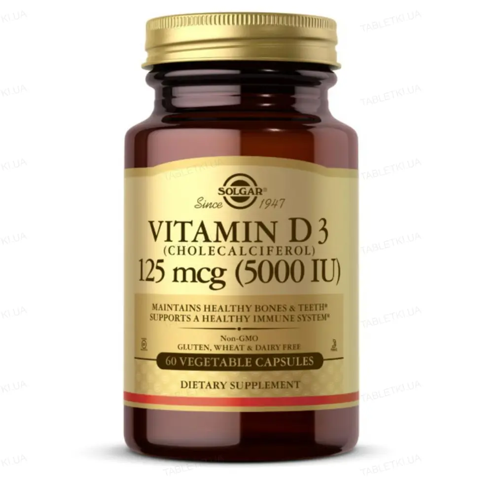 Витамин Д3 (холекальциферол), Vitamin D3, Solgar, 125 мкг (5000 МЕ), 60 капсул