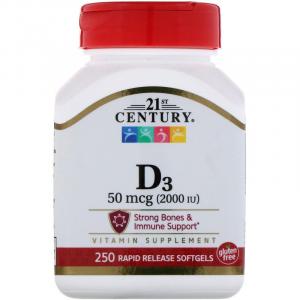 Витамин D3, Vitamin D3, 21st Century, 50 мкг (2000 МЕ), 250 мягких желатиновых капсул