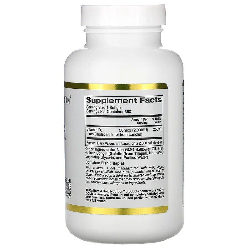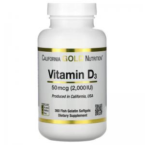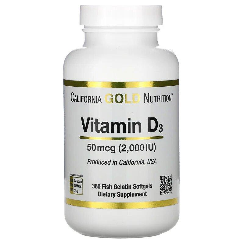 Витамин D3, Vitamin D3, California Gold Nutrition, 50 мкг (2000 МЕ), 360 рыбно-желатиновых капсул