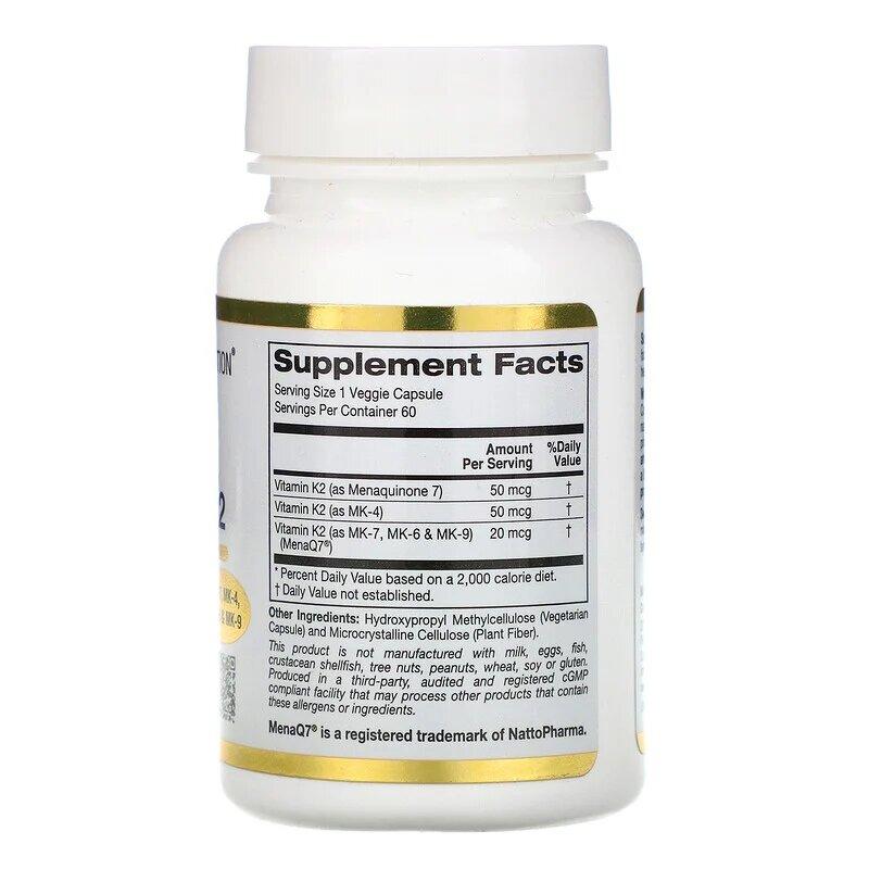 Препарат в виде капсул без вкуса и запаха, содержащий полный спектр витаминов K2 от California Gold Nutrition, смеси MK-4, MK-6, MK-7, MK-9 и менахинон-7. Применяется для поддержки костно-суставной и сердечно-сосудистой систем. Может употребляться вегетарианцами и веганами. Возрастное ограничение 18+. Рекомендуется принимать в комплексе с витамином D3, для лучшего усвоения кальция. В составе отсутствуют ГМО, глютен и соя.