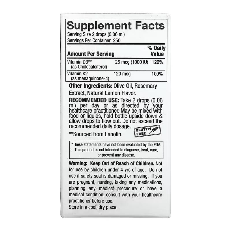 Витамины D3 и K2, Vitamin D3 & K2, Nature's Answer, 25 мкг (1000 МЕ) и 120 мкг, 15 мл
