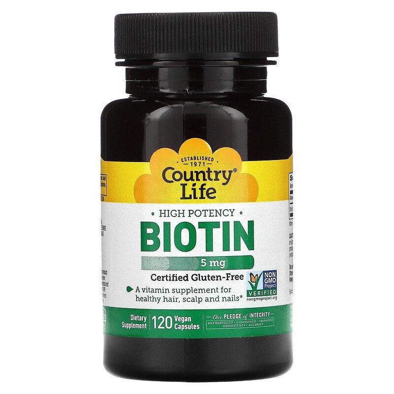 Высокоэффективный биотин, High Potency Biotin, Country Life, 5 мг, 120 вегетарианских капсул