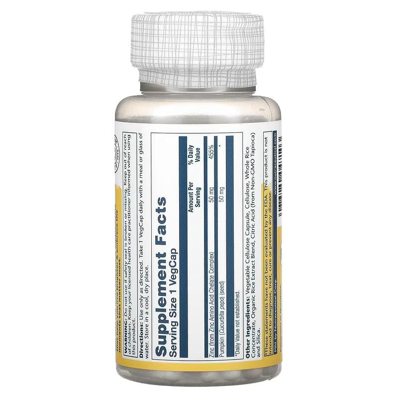 Цинк, Zinc, Solaray, 50 мг, 100 растительных капсул